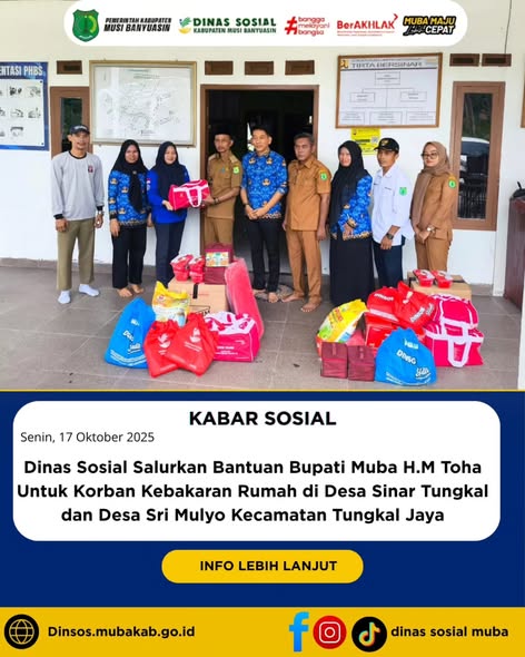 Dinas Sosial Salurkan Bantuan Bupati Muba H. M. Toha untuk Korban Kebakaran Rumah di Desa Sari Agung Senin, 9 Februari 2026Dinas Sosial Salurkan Bantuan Bupati Muba H. M. Toha untuk